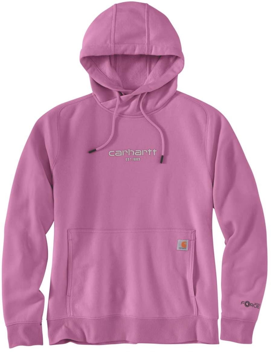 RELAXED FIT, tessuto 60% cotone / 40% poliestere 7.4 oz/yd² – 251 gsm. STAIN BREAKER™ – Antimacchia. FAST DRY® – Elimina l′umidità per il massimo comfort e combatte gli odori con finitura antimicrobica. CARHARTT FORCE® – FastDry con proprietà antimicrobiche. Cappuccio in tre pezzi attaccato con cordino regolabile. Manica lunga raglan. Tasca a marsupio sul davanti con taschino interno in rete per dispositivi elettronici. Polsini e cintura in maglia a costine rinforzata in elastan elasticizzato. Grafica stampata sulla parte frontale. Etichetta Carhartt Force® sulla manica sinistra. Etichetta Carhartt cucita sulla tasca.