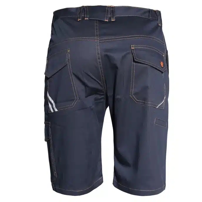 Bermuda stretch con inserti retroriflettenti, dotato di due tasche frontali, due posteriori coperte da pattina, una tascone laterale con soffietti ed una tasca porta metro.